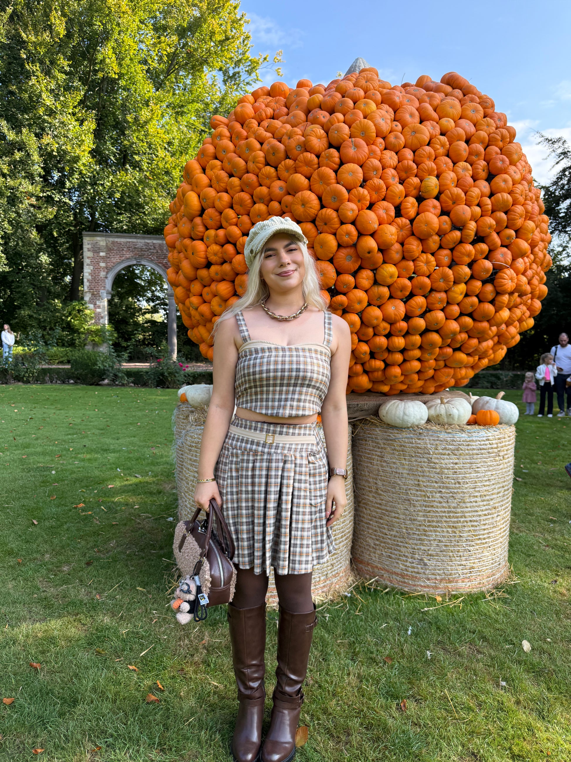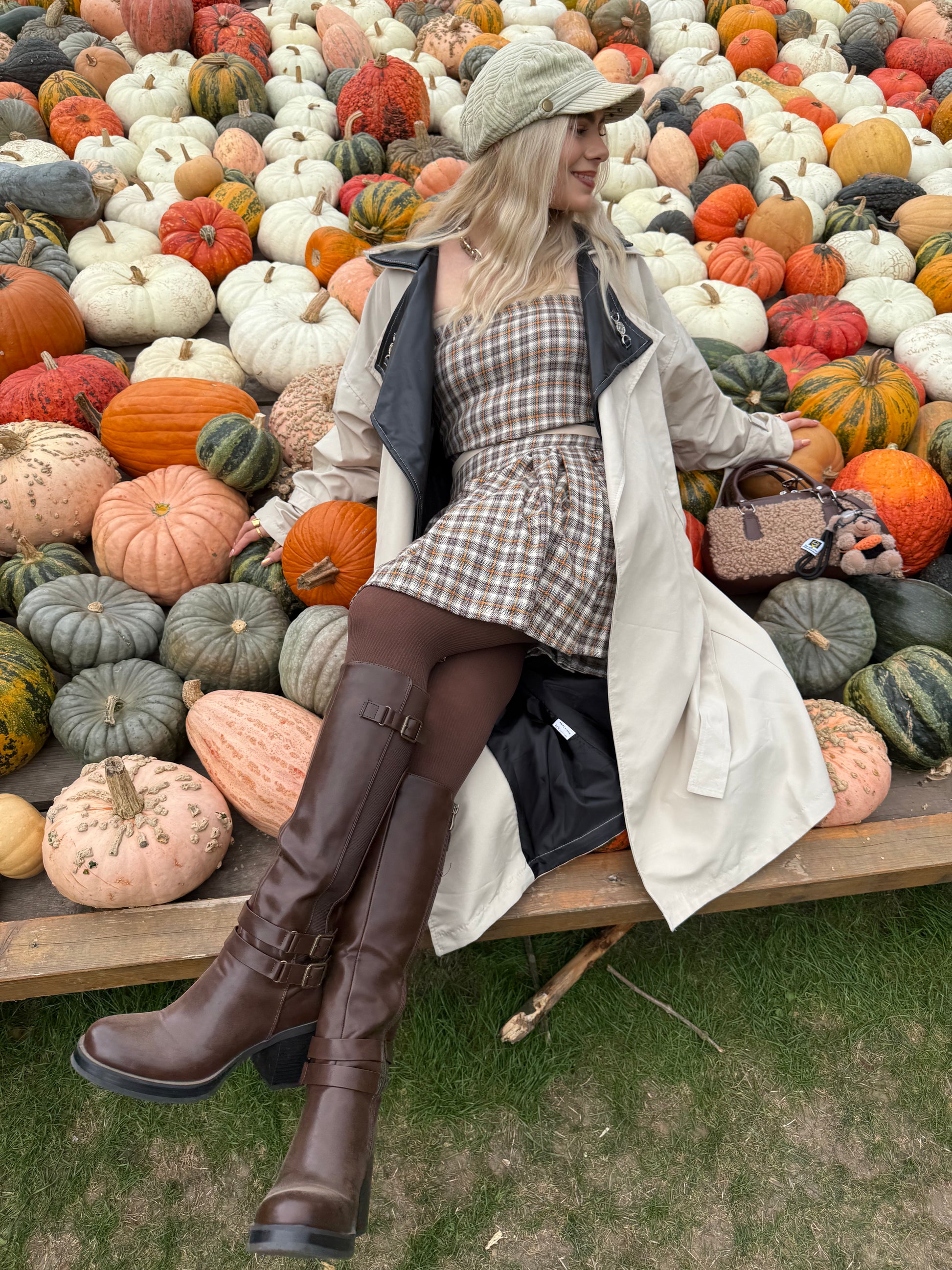 Crafted in a warm taupe-brown, orange and beige plaid fabric. Style it with knee-high boots and gold jewelry for that picture-perfect fall aesthetic — whether you’re strolling through a pumpkin patch or heading to brunch. 🍂✨