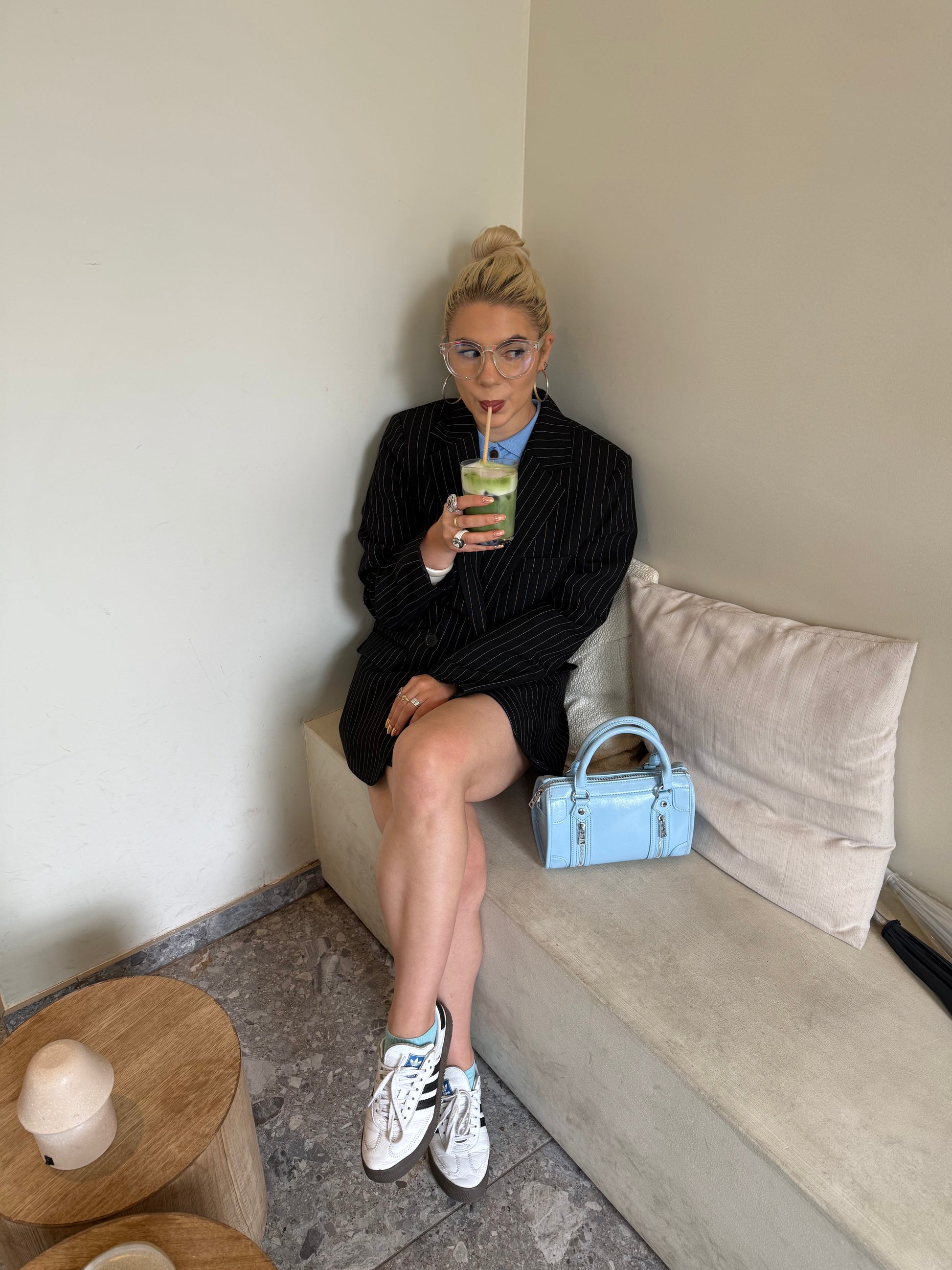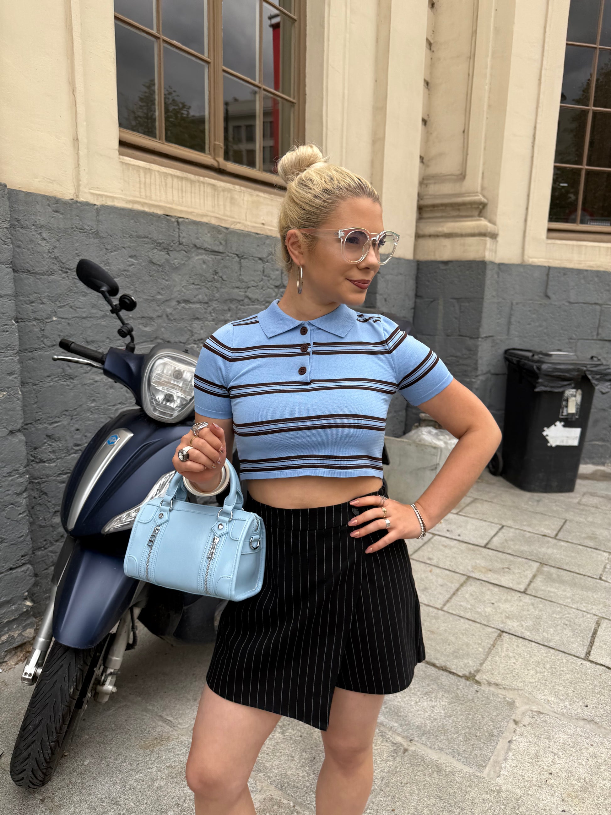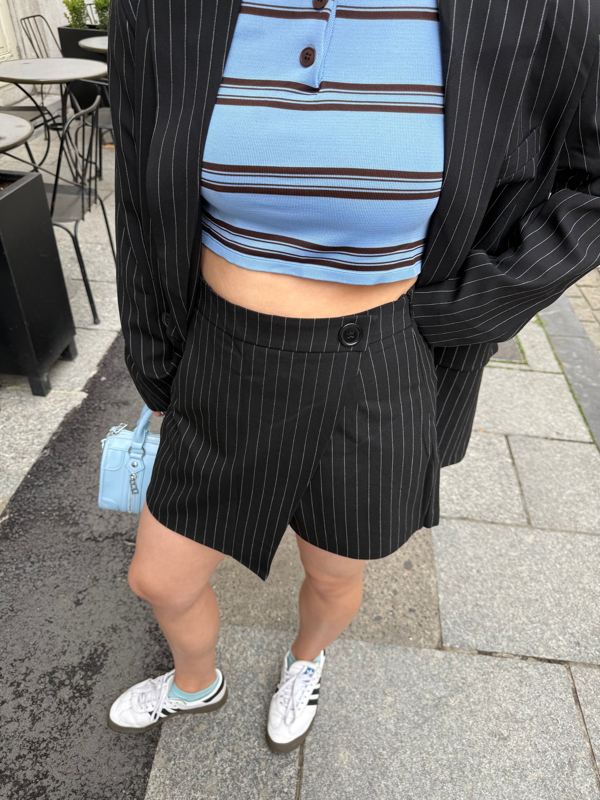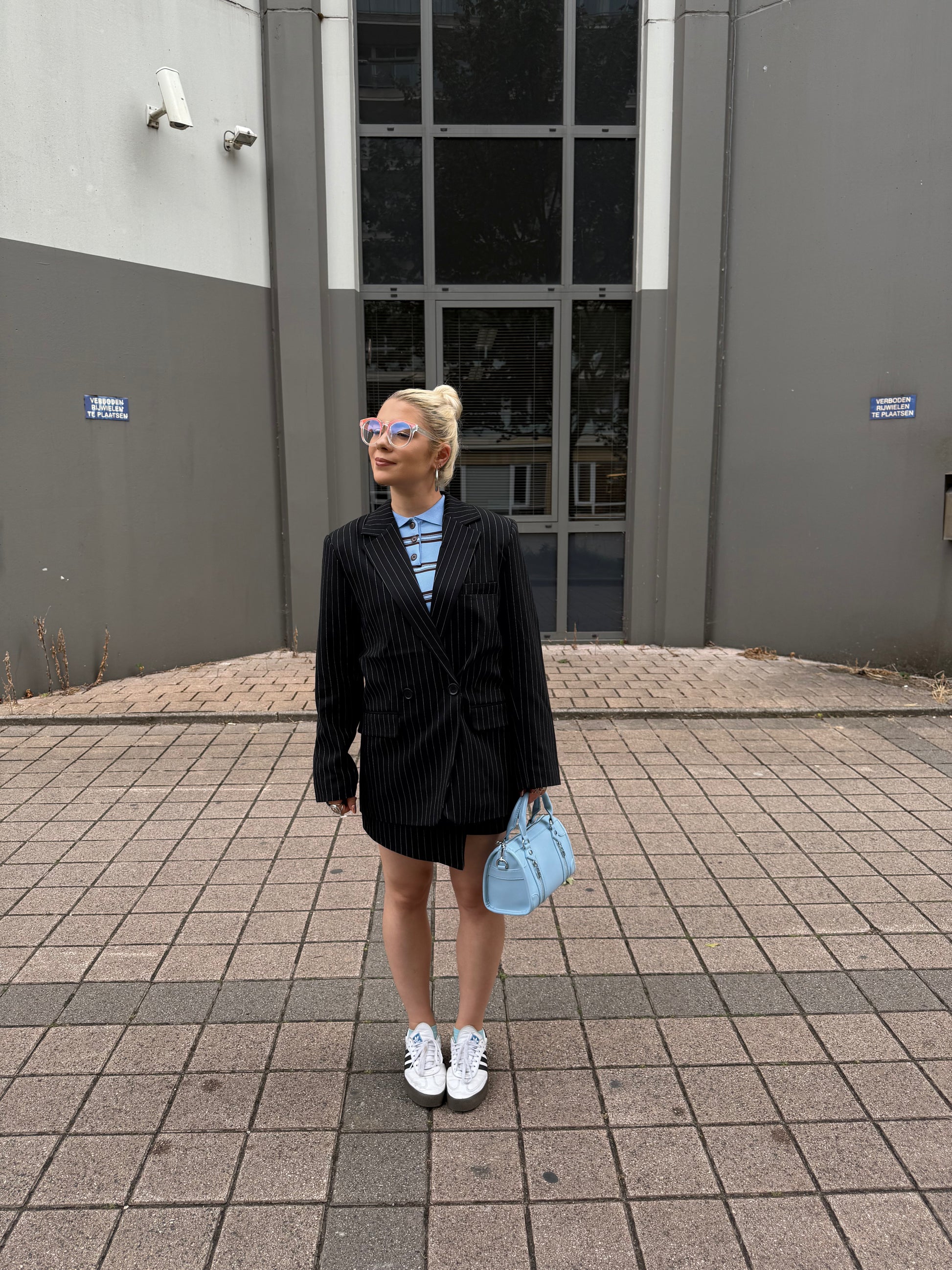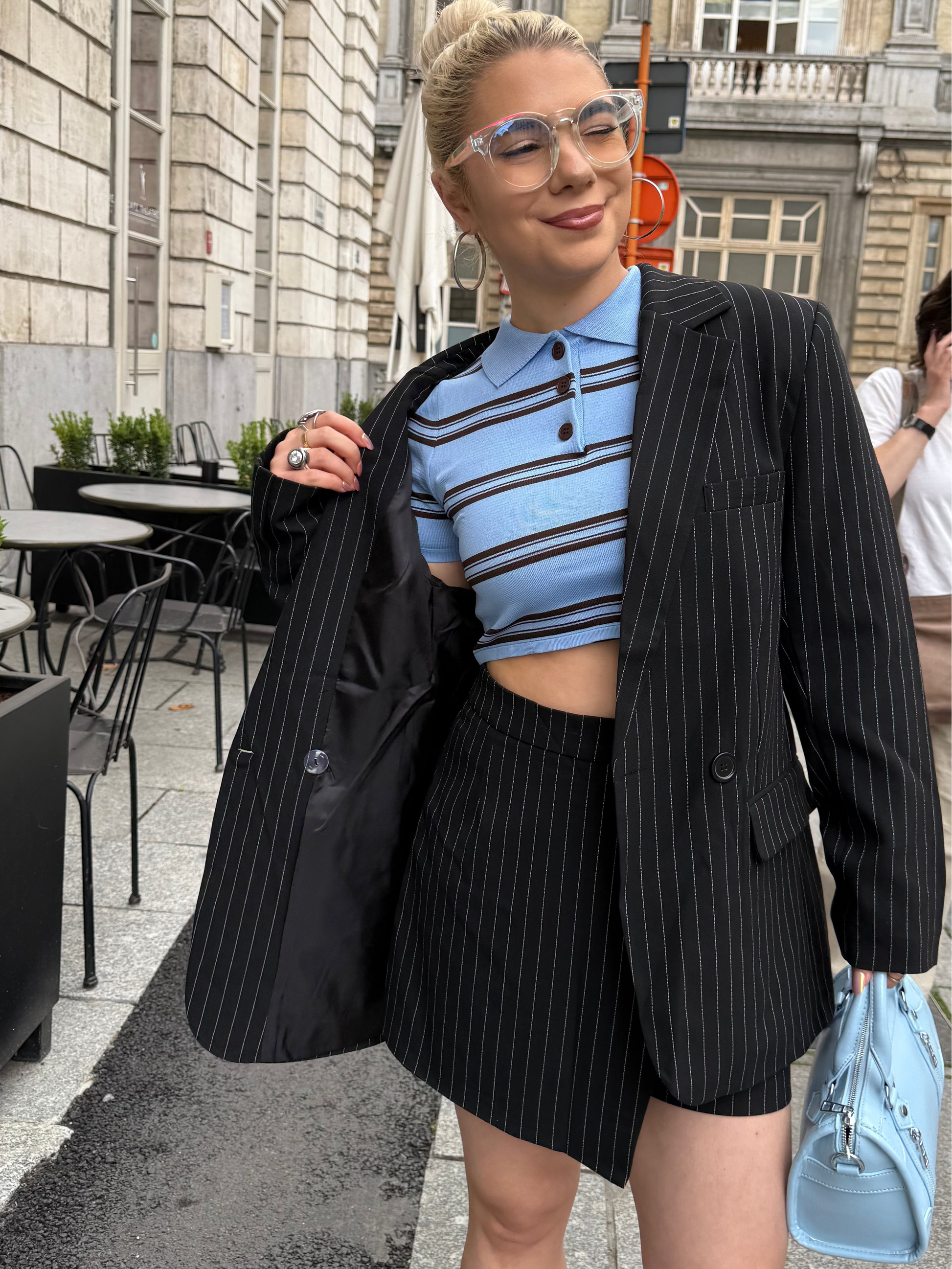 This is our (Jack) SKELLINGTON Pinstripe Suit Set (aka your new wardrobe crush) featuring a structured oversized blazer with sleek vertical stripes and a matching asymmetric mini skort, this set takes you from meetings to martinis effortlessly.
